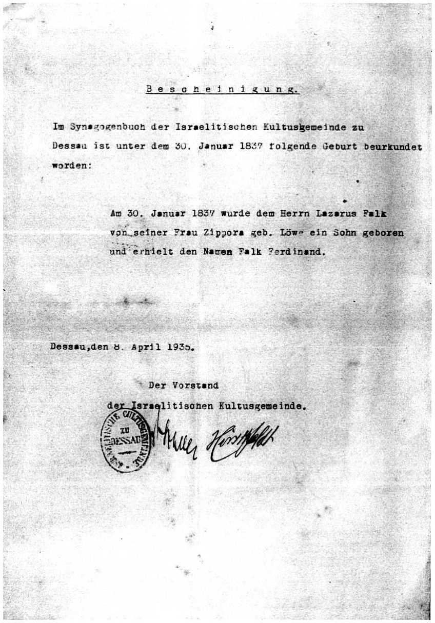 | 30 Jan 1837 Certificate in the Synagogue Book in Dessau